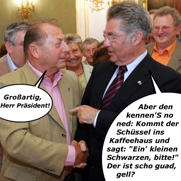 Er meinte zwar die Zeit vor der Krise mit der SPÖ, klingt aber trotzdem lustig. Im Prinzip muss man als Politiker immer nur lang genug warten, ehe man für Überraschungen sorgthofburg.at hat geschrieben: Wien - Bundespräsident Dr. Heinz Fischer hat heute (Donnerstag, 9. Juni 2005) Dipl.Ing. Simon Wiesenthal das Große Goldene Ehrenzeichen für Verdienste um die Republik Österreich überreicht. In der Begründung für diese Auszeichnung heißt es u.a., dass "Dipl.Ing. Simon Wiesenthal wesentlich dazu beigetragen (hat), einige der größten NS-Verbrecher in ihren Nachkriegsverstecken aufzuspüren und einer gerichtlichen Verurteilung zuzuführen." Simon Wiesenthal habe sich um die Ahndung schwerster Verbrechen in einer Zeit verdient gemacht, in der ihm seine Arbeit in Österreich nicht immer leicht gemacht wurde.