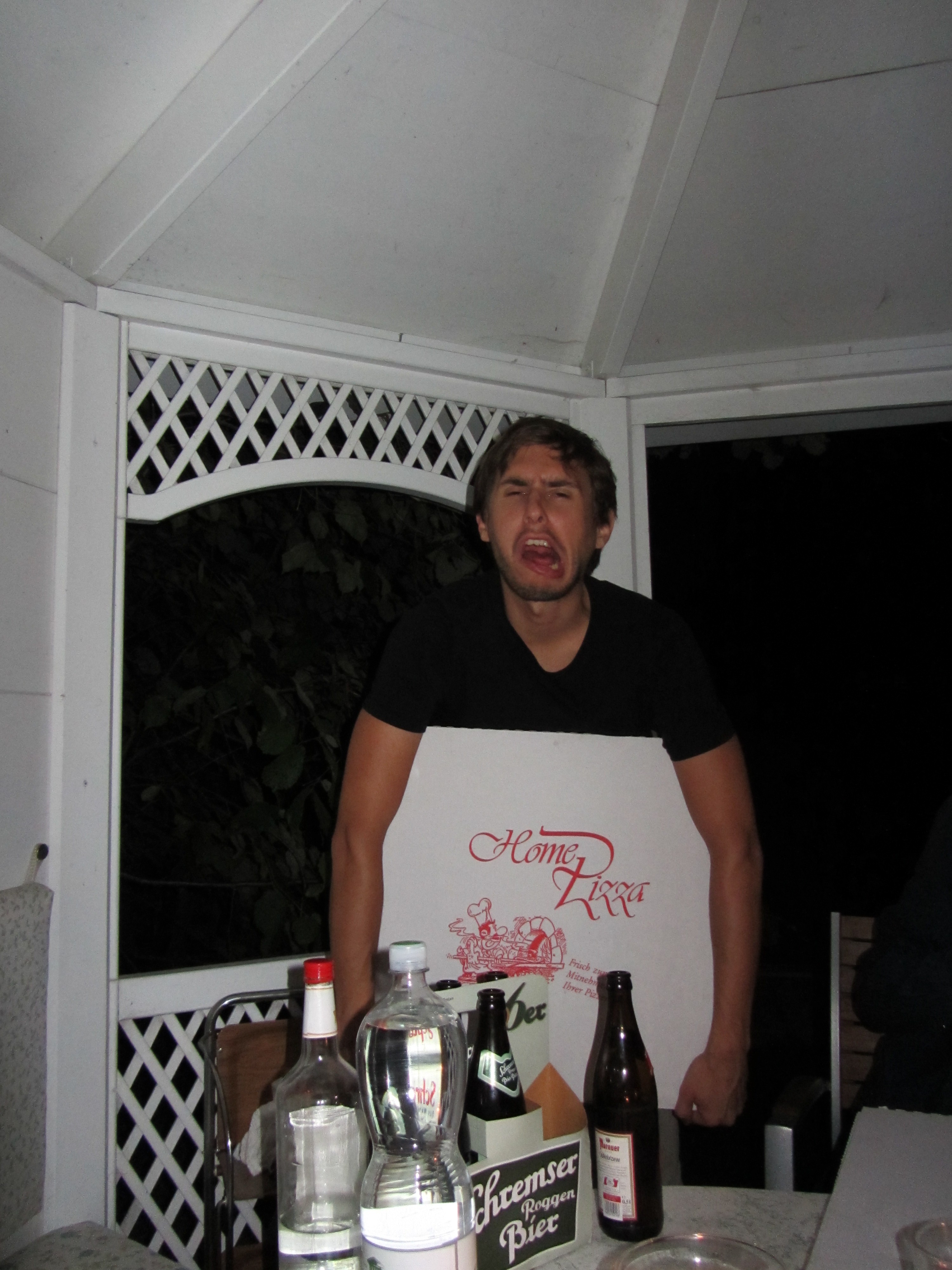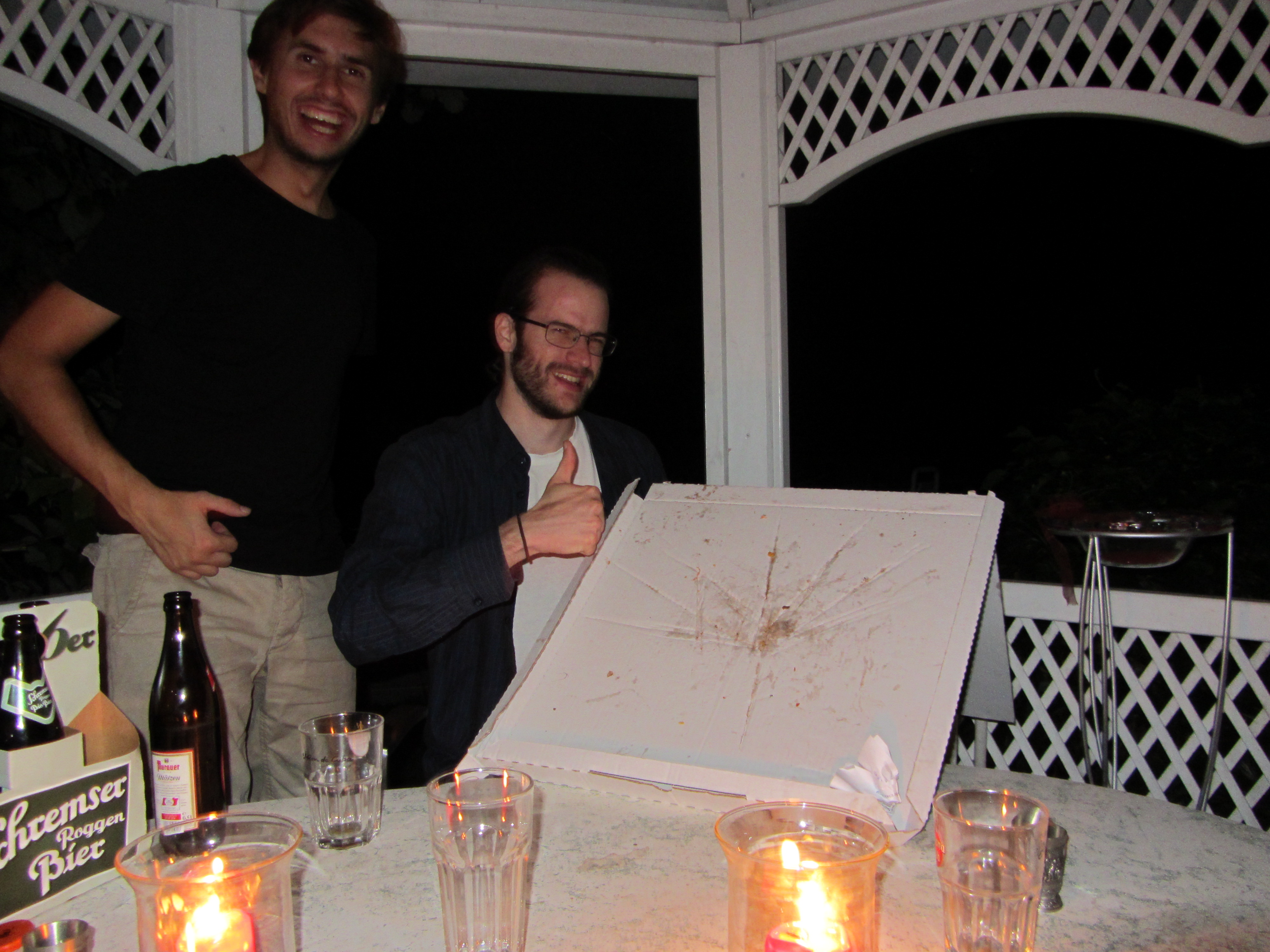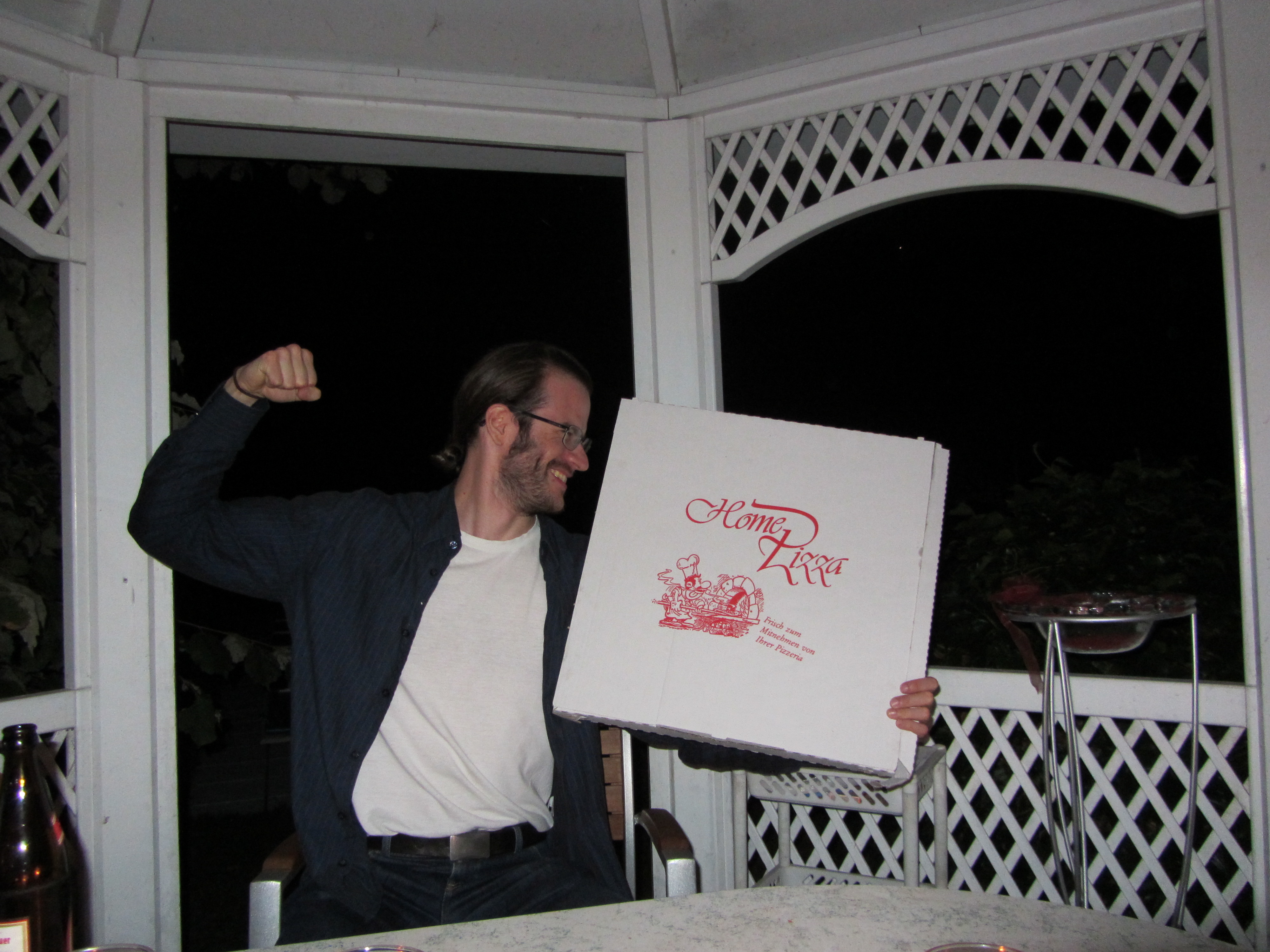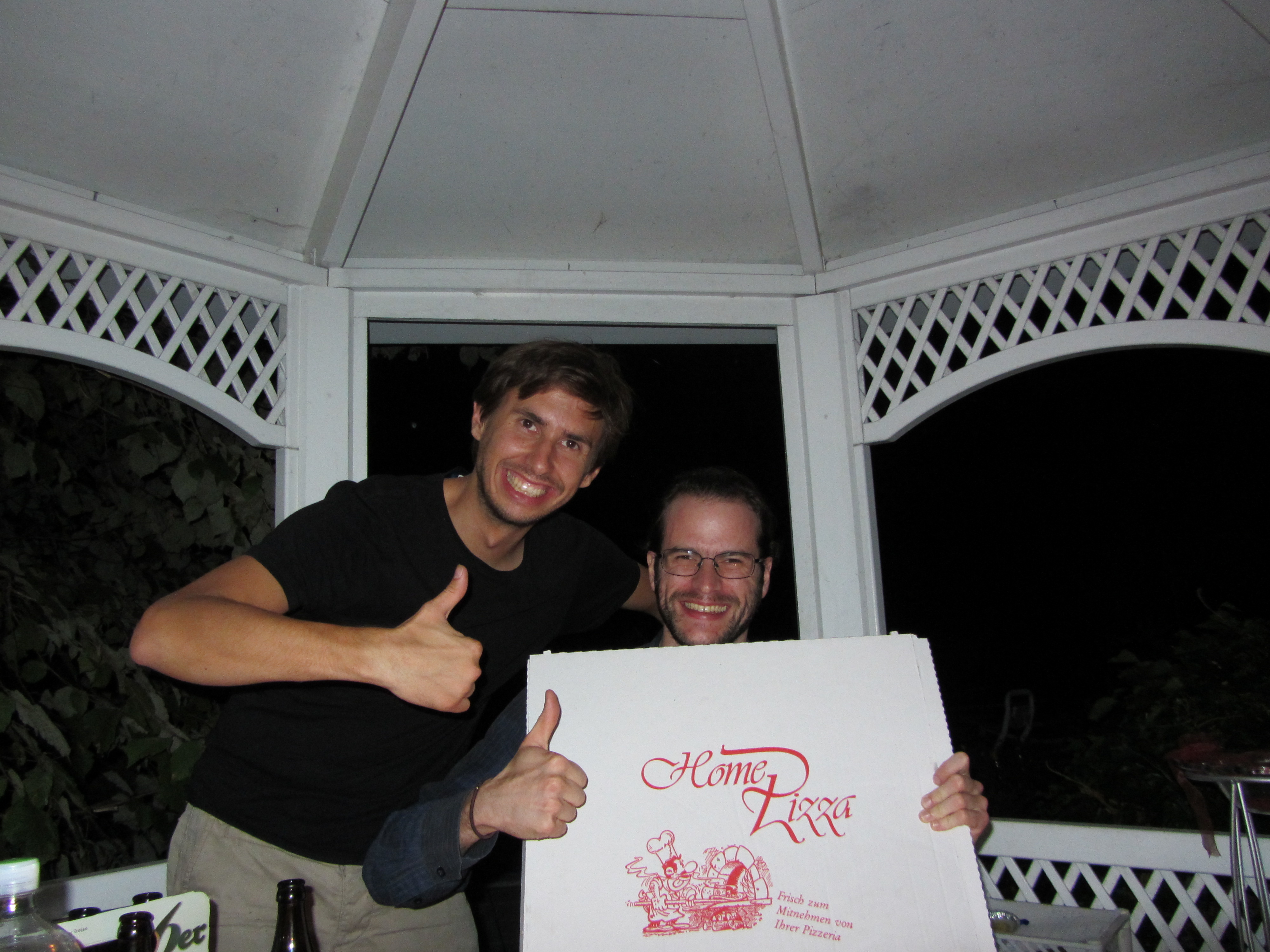 Na bitte, alles dabei. Nur kein Photo von der eigentlichen Pizza. :D Dafür ein Beweis, dass es noch vor Mitternacht war. Der Daumen war auch wieder mit dabei...