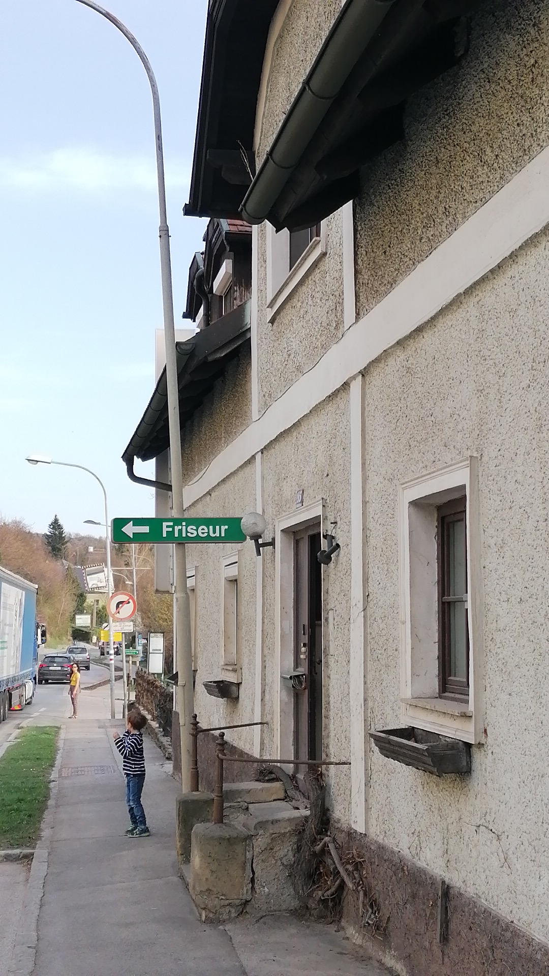 Damit auch wirklich keiner den Salon verfehlen kann, ist das Logo nicht nur in vierfacher Ausfertigung angebracht worden, sondern es ist auch fuer diejenigen Hanseln, die ausschlieszlich auf der anderen Straszenseite nach dem Friseur Ausschau halten, gleich gegenueber ein Wegweiser angebracht worden: