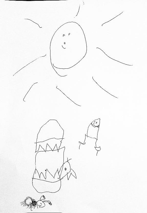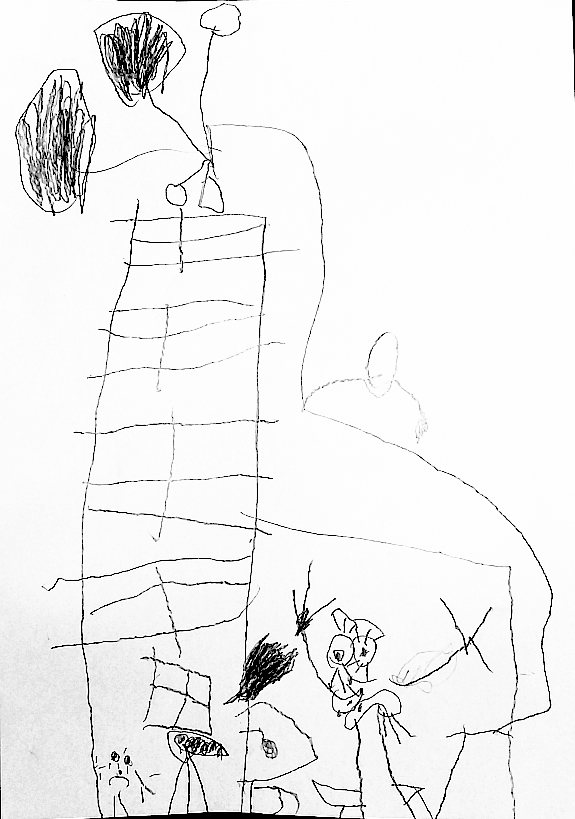 Die Zeichnung trägt den Titel "Dödölle [Anm.: unten links], wie er gerade weint, weil ich ihm sein Lieblingsplüschtier weggenommen habe"