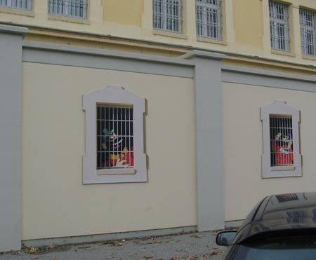 Warum post ich das? Das geniale ist, die haben die Panzerknackerdarstellung auf die gegenüberliegende Justizanstalt ausgedehnt, mit Bildern auf Holzfaserplatten, die von der Weite total räumlich wirken :D