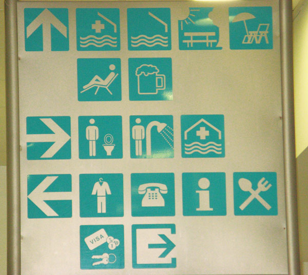 Piktogramm-Matrix mit coolem "Getränke"-Symbol im ungarischen Heil- und Thermalbad Bükfürdö (an Position (2,3))