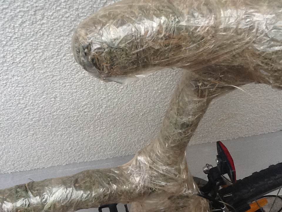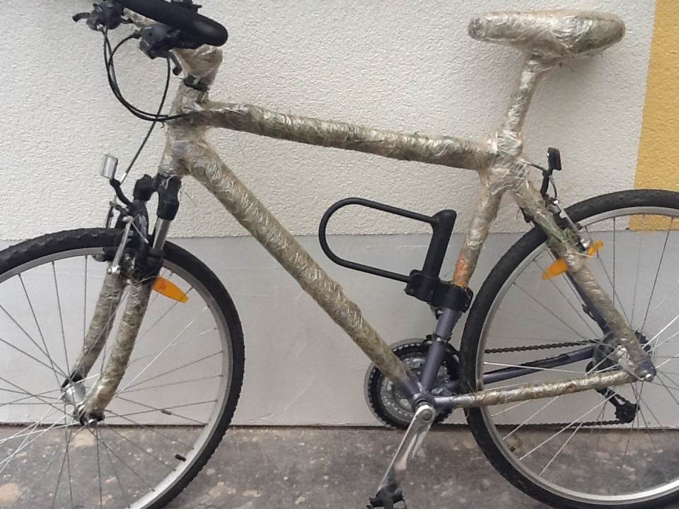 Ich hab den Rahmen von meinem Zweitrad mit Sprühkleber eingesprüht, dann Heu rundherum gewickelt, und das ganze mit einem Klebeband umwickelt. Hat wie gesagt den Sinn, Diebe so gut wie möglich abzuschrecken (zu verekeln), weil ich das Fahrrad u.a. am Bahnhof abstellen will.