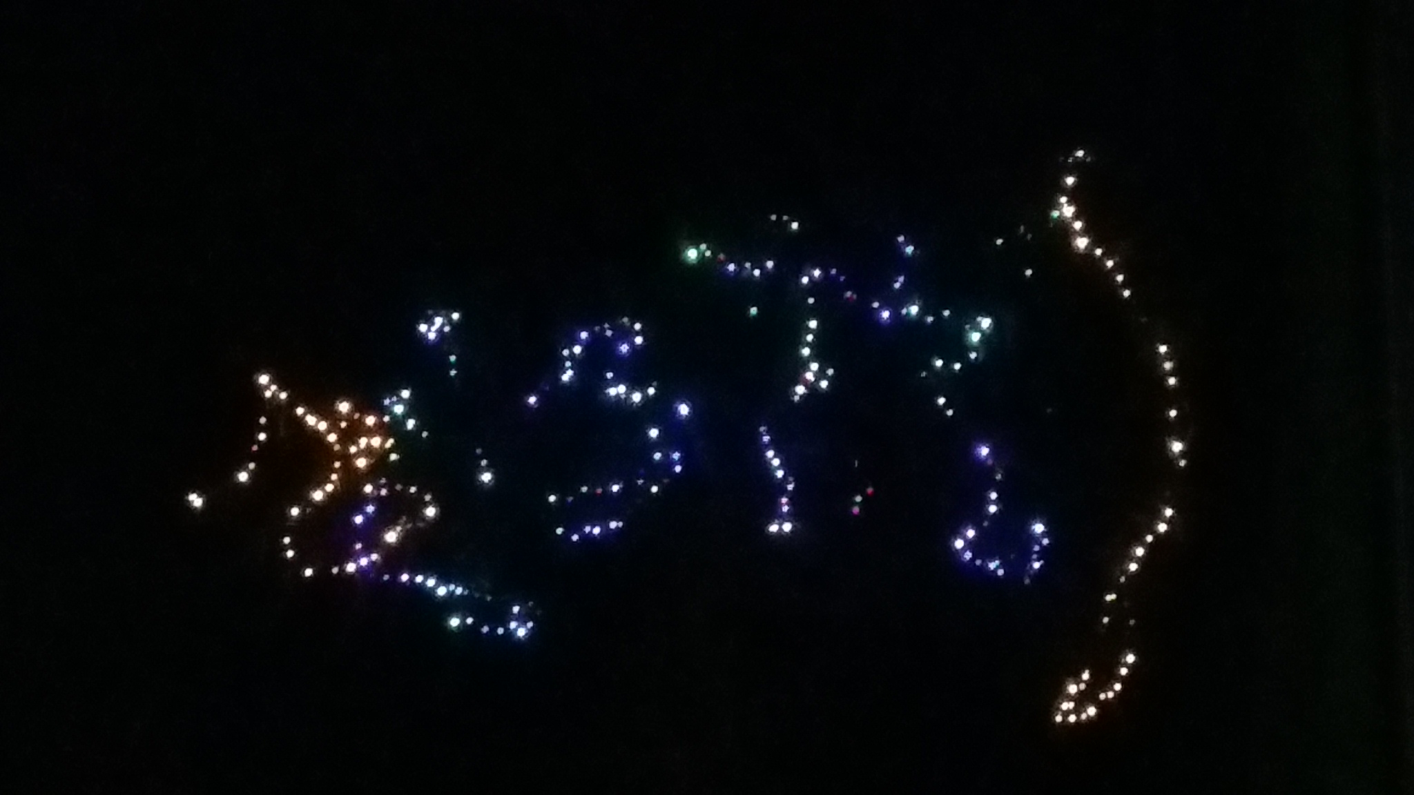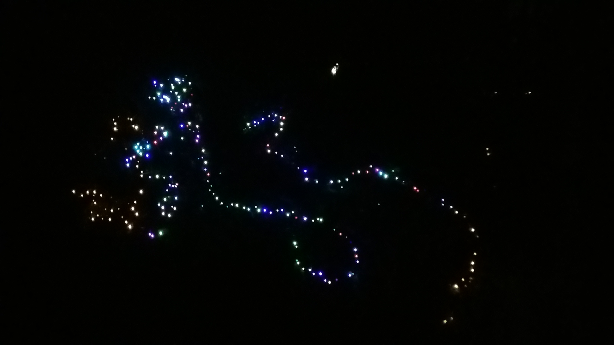 Man koennte meinen, die Lichterketten sind einfach nur irgendwie hingeschmissen worden, wenn man aber genau hinschaut, erkennt man, dass der eine Baum einen Rentiermann darstellt, der andere eine Rentierfrau.