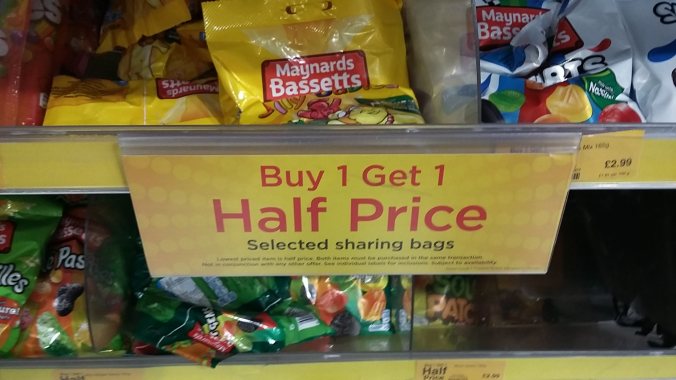 Der Kunde liest: "Buy 1, get 1 - half price"