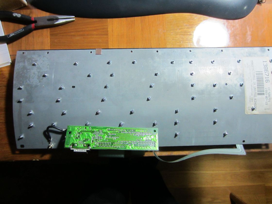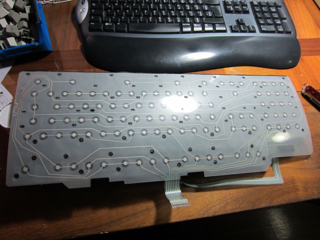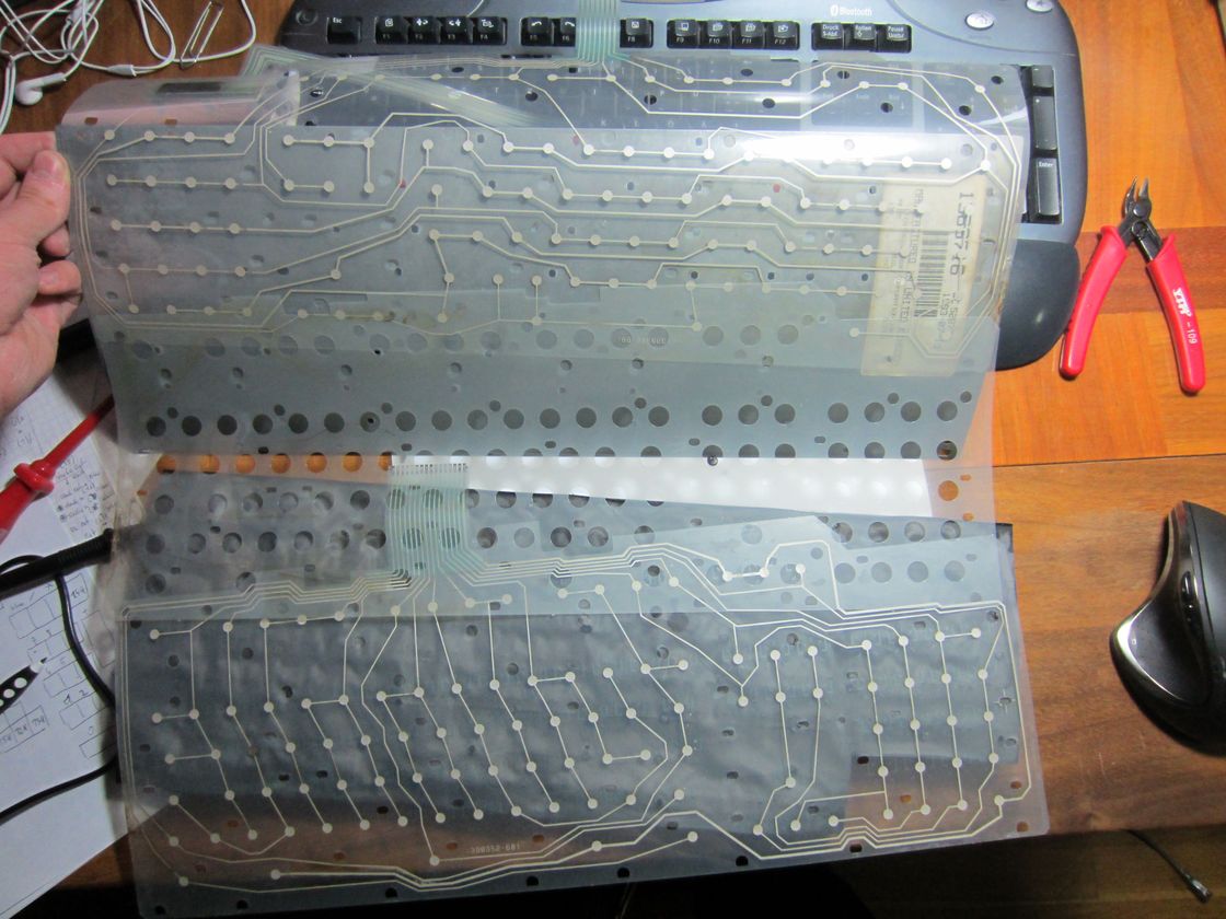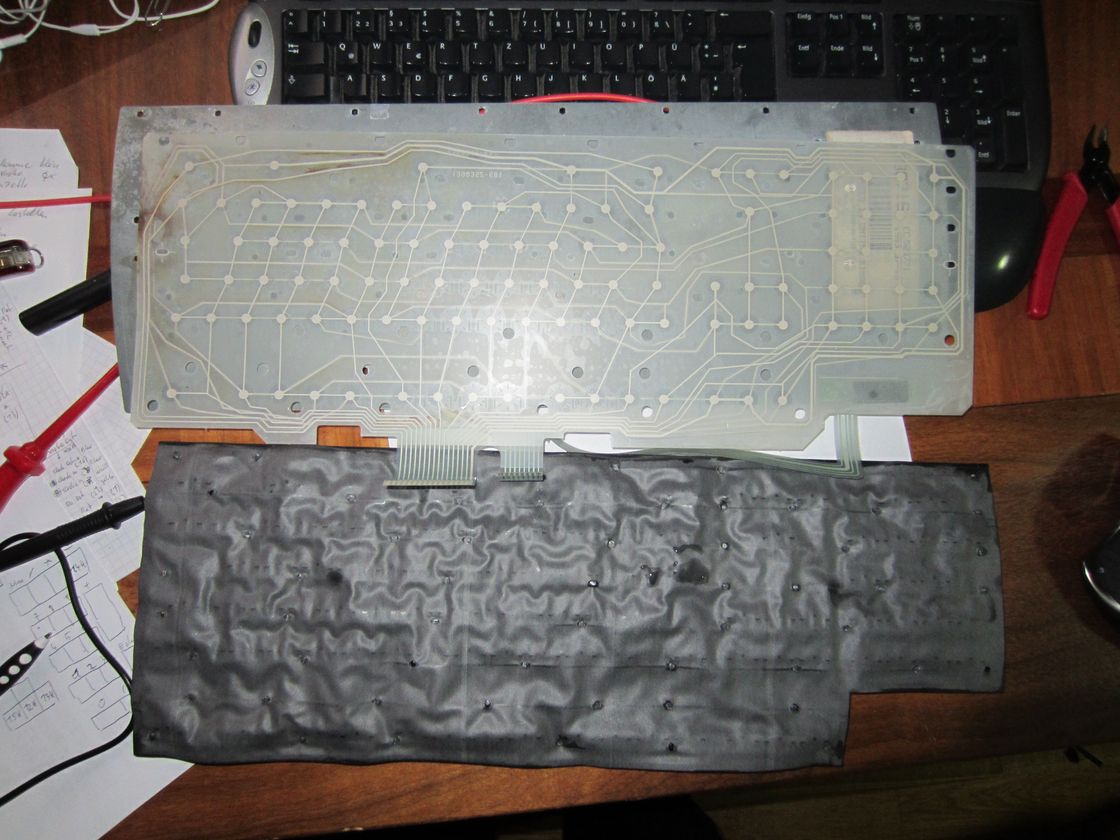 Durch das Cola wurde anscheinend eine der Folien-Leitungen beschädigt, die Leitung auf der oberen Foile außen ist unterbrochen über eine Länge von ~2cm, muss mittels Draht überbrückt werden. Das Anlöten auf der Plastikfolie ist eine ziemliche Schweinerei, funktioniert aber und hält höchst überraschendererweise sogar!