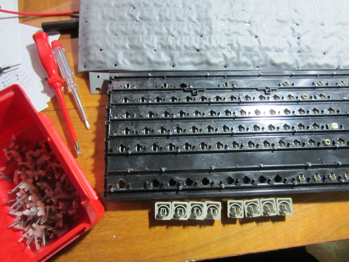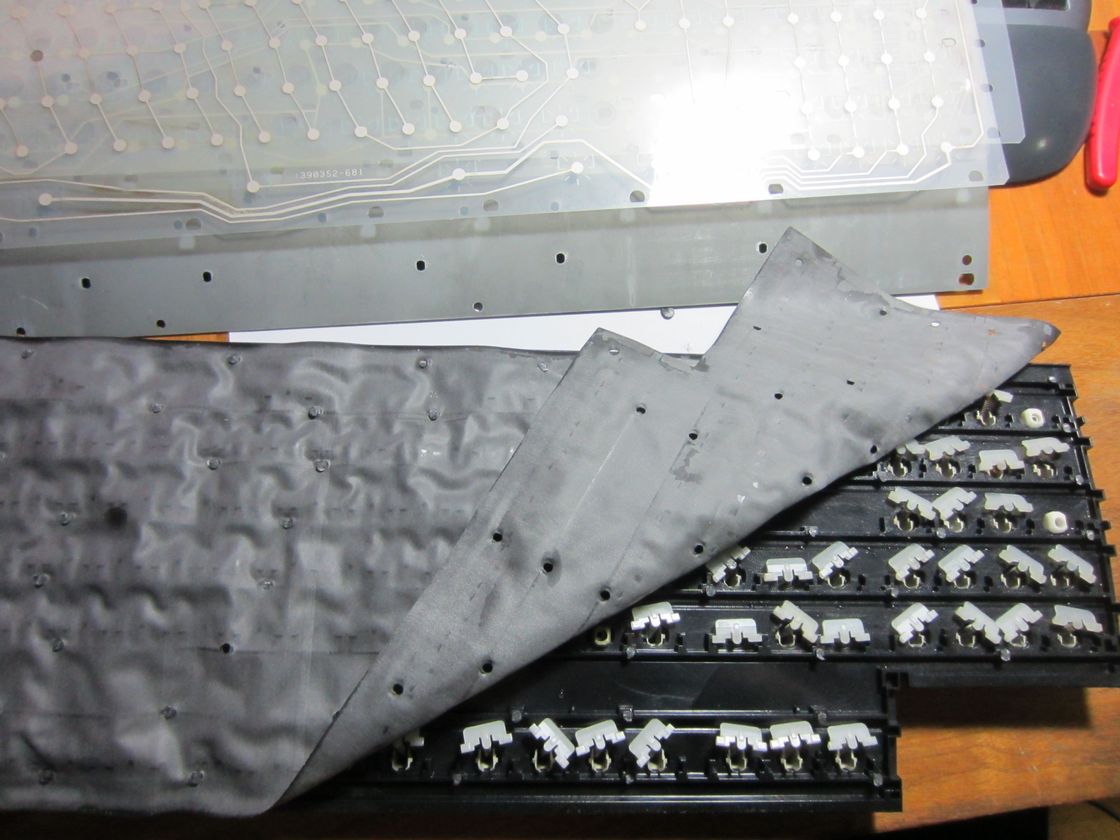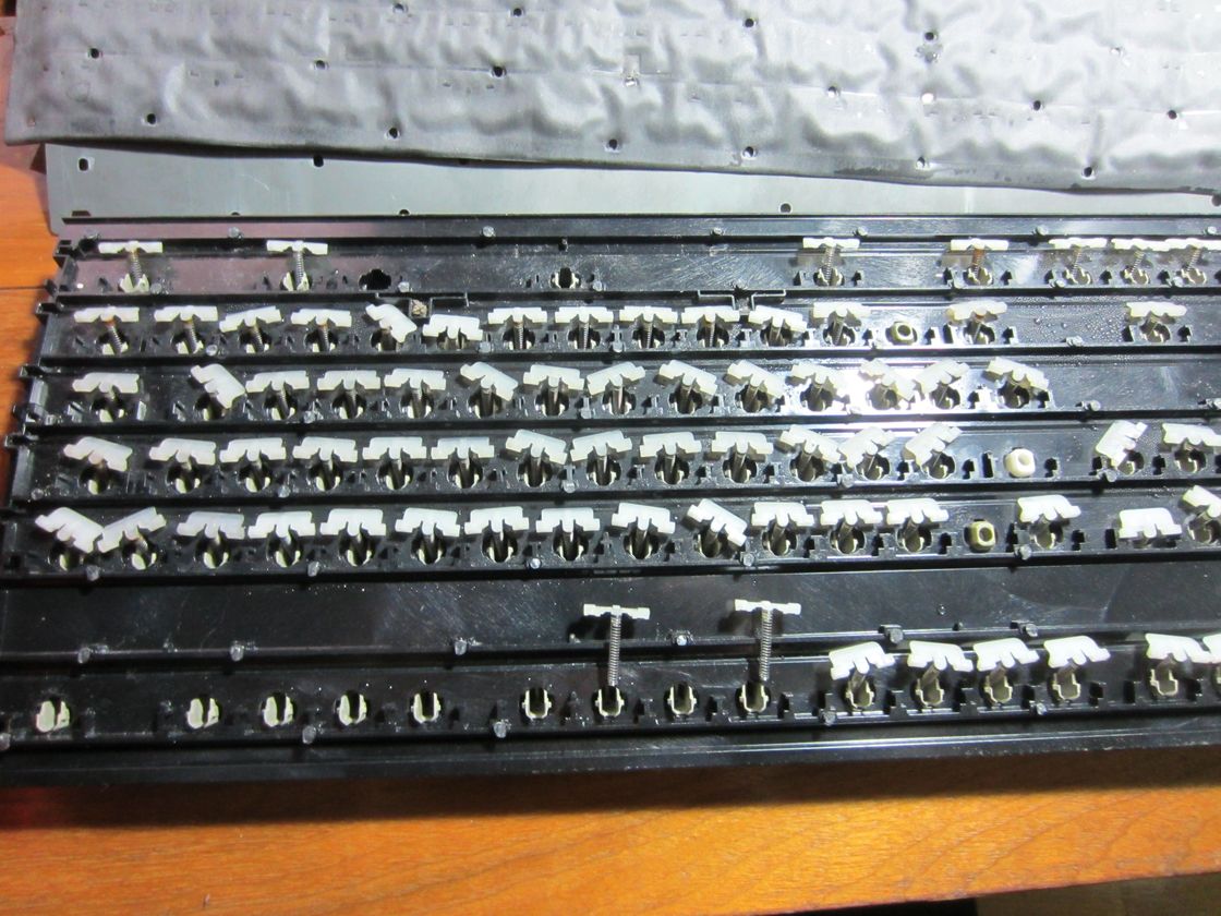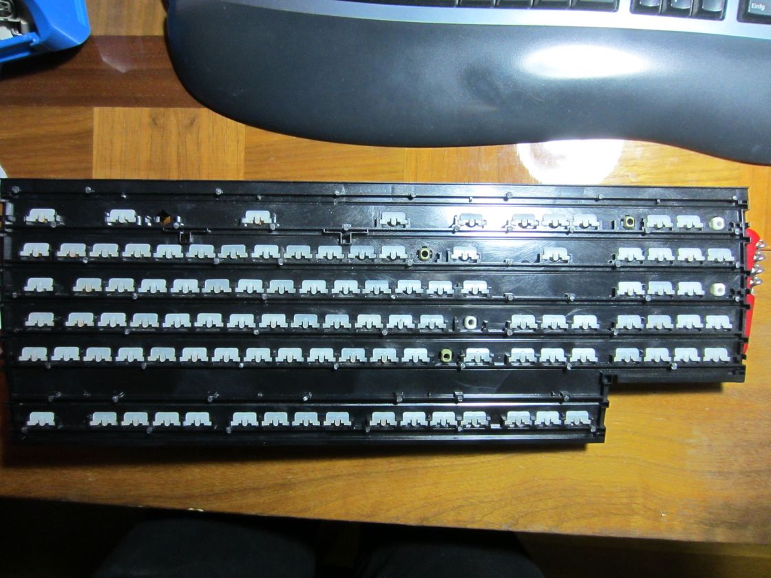 Im Nachhinein betrachtet hätte wahrscheinlich die Hälfte der Schrauben auch gereicht, vorher waren das ja einfach nur Plastiknoppen, die halten ja nicht so viel Zug aus wie Schrauben. Die Folie verrutscht sicher nicht, die sitzt schon mit 2-4 Schrauben praktisch fest. Ich weiß allerdings nicht wie empfindlich der Aufbau gegenüber kleinen Spalten zwischen den Folien ist, eigentlich sollts nicht viel machen (außer einem unterschiedlichen Tastenhub), aber was weiß man (die unterste Reihe Löcher hat eh keine Schrauben drin, da ist ne Stufe im Plastik auf der anderen Seite). Dafür ist die Tastatur jetzt noch ein bissl schwerer und robuster ;)