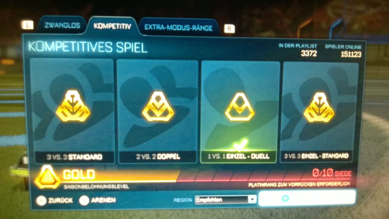 Leider hab ich die letzten 3 Einstufungsspiele in "3vs3 Einzel-Standard" verloren (0:1, 0:1 und im Dritten ein quasi-disconnect in meinem Team). Sonst wär sogar Platinum möglich gewesen.